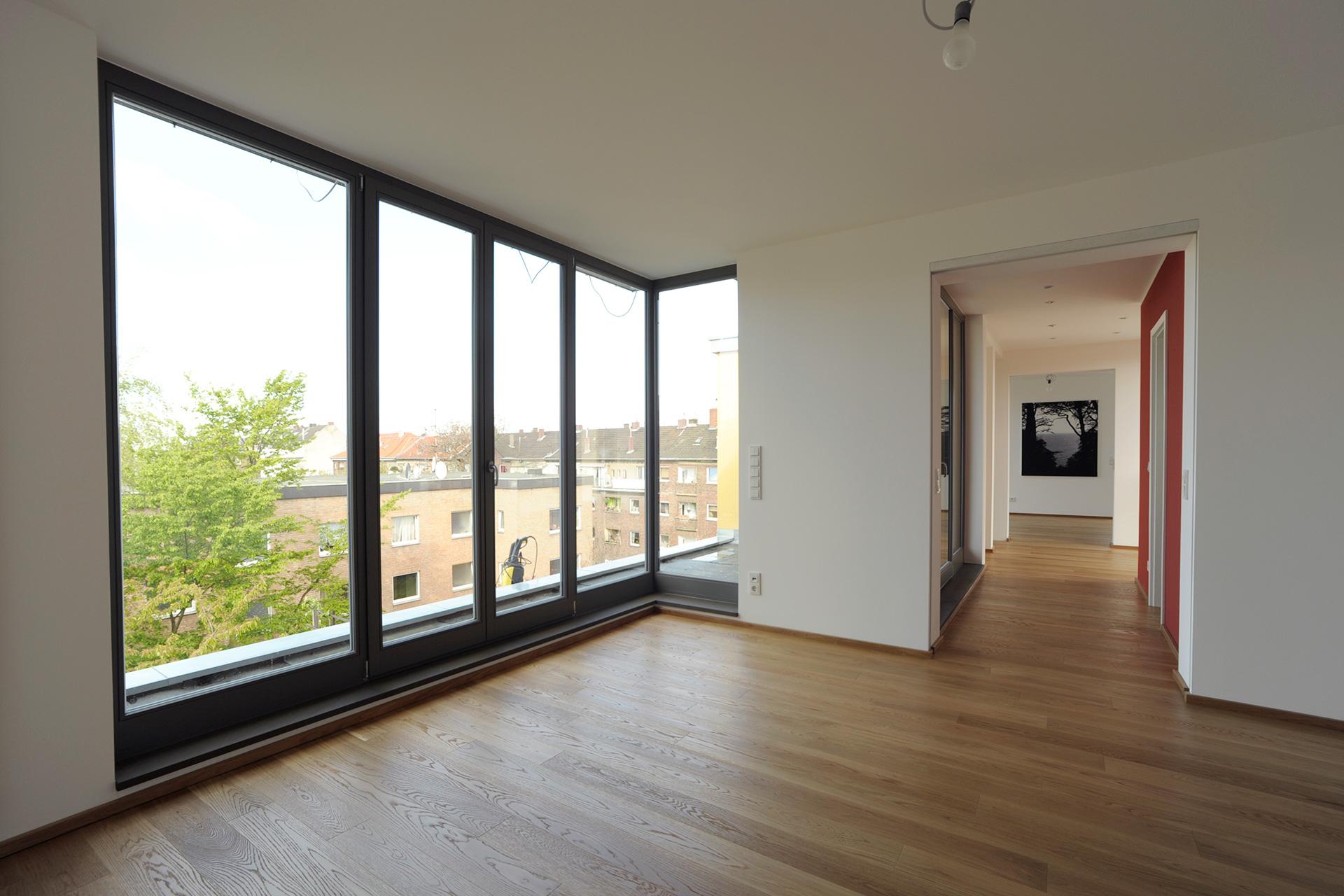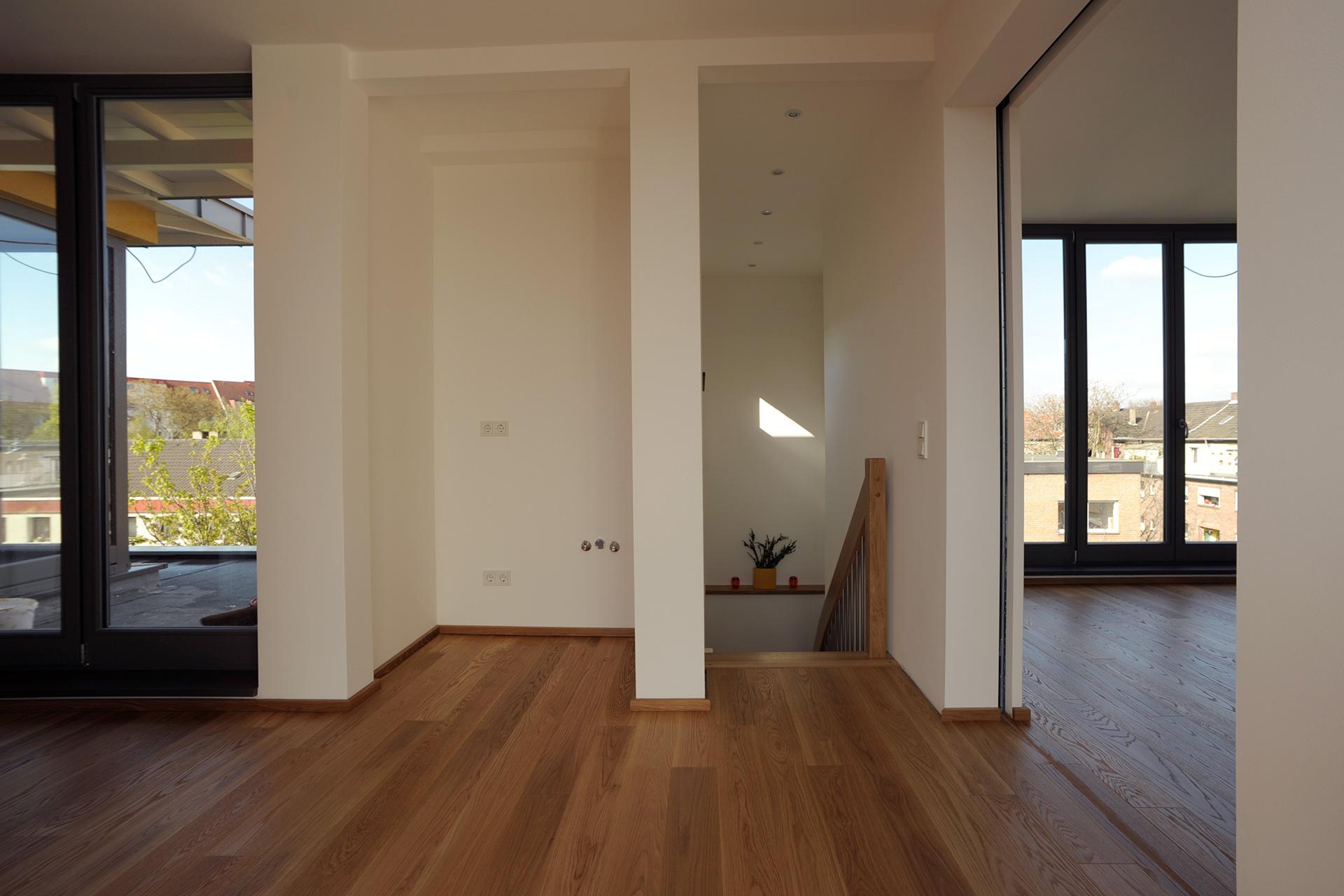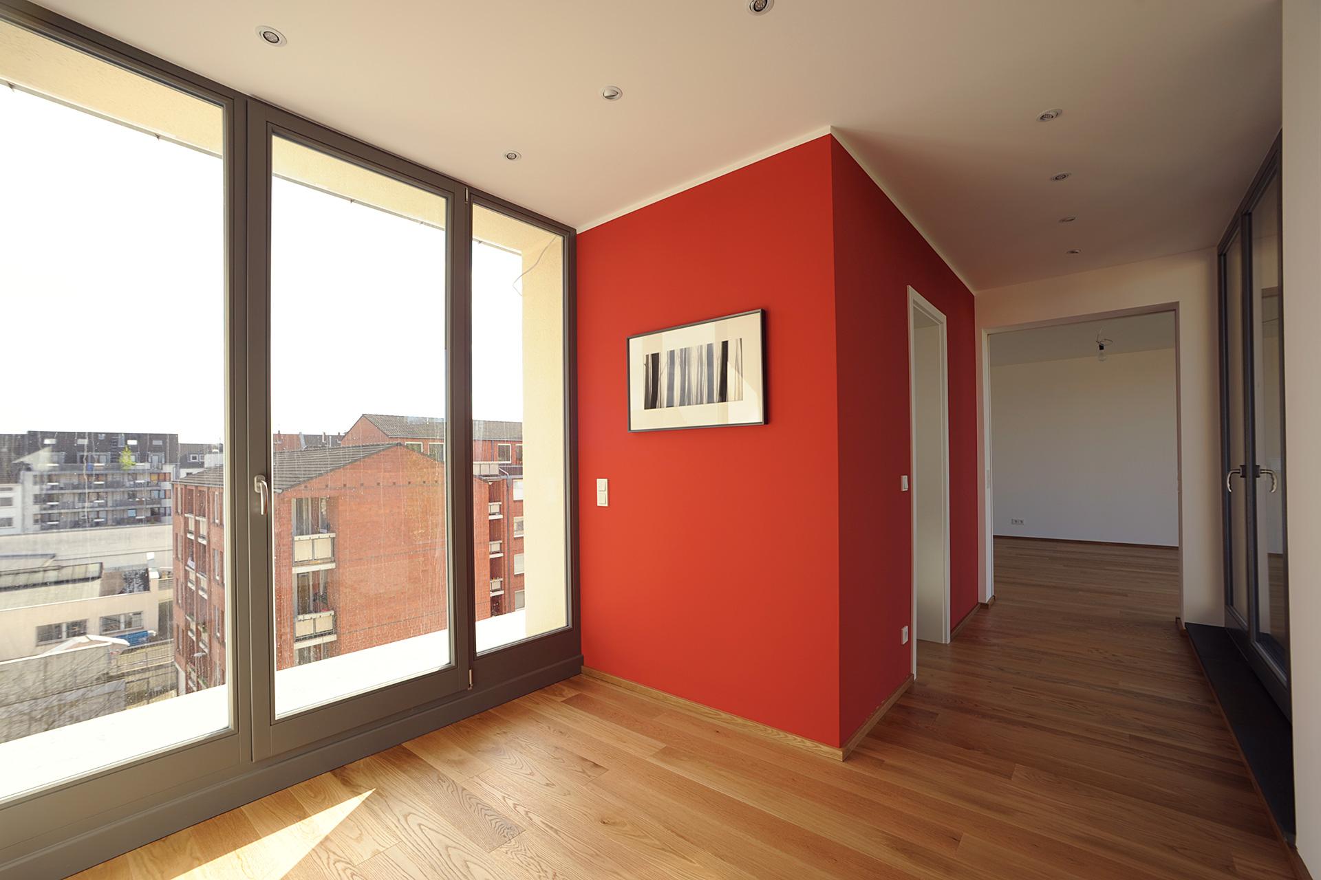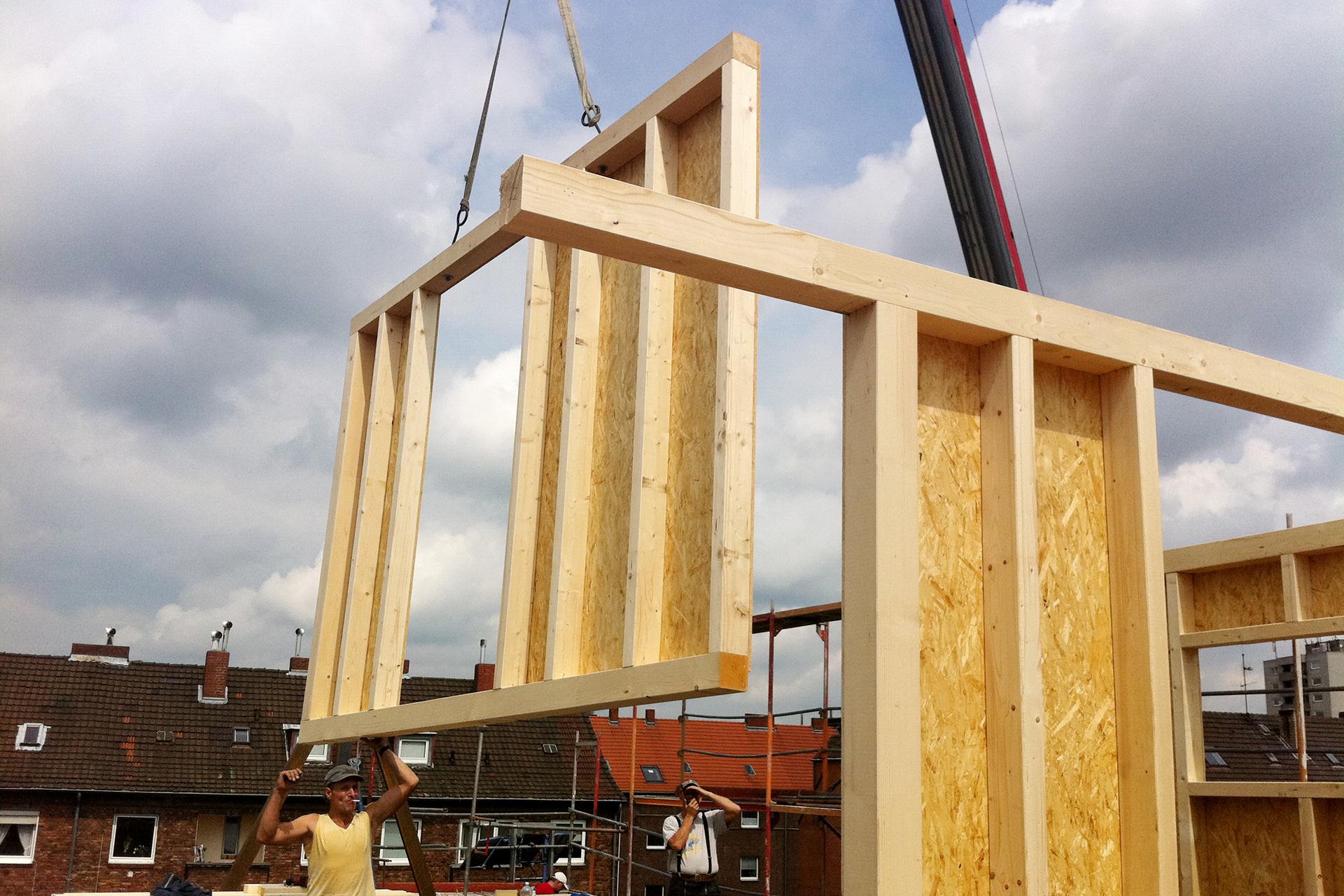 Auf dem Dachgeschoss eines Gebäudes aus den 60er Jahren war aufgrund der statisch nicht ausreichend ausgebildeten Decke eine leichte Konstruktion erforderlich. Dazu wurde im 5. OG ein 14,50 x 7,50 m großer Stahlrahmen aufgelegt und darauf die Holztafelwände montiert.
