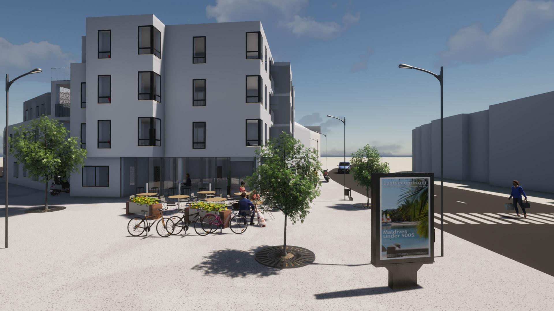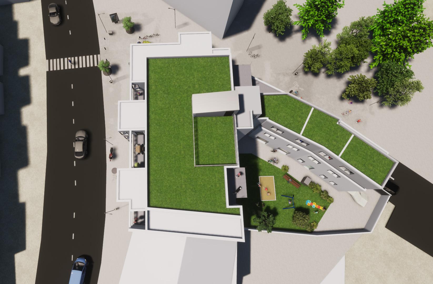 In die Gewerbeeinheiten sollen die Fahrschule der Bauherrschaft, eine Kita zur lokalen Versorgung und ein Eiscafé einziehen.